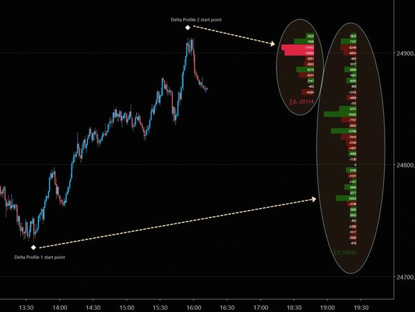 The Delta Profile indicator maps net buying and selling pressure across price levels, offering a granular view of market aggression and absorption. Unlike time-framed delta, this overlay aggregates delta vertically—revealing where traders are most active, most committed, or most trapped.